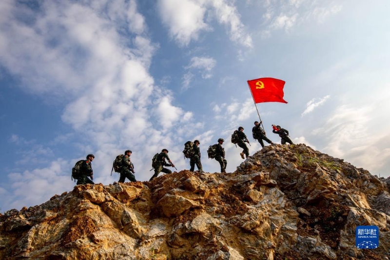 武警廣西總隊賀州支隊組織搶占制高點訓練,黨員先鋒隊率先登頂(6月30日攝)。