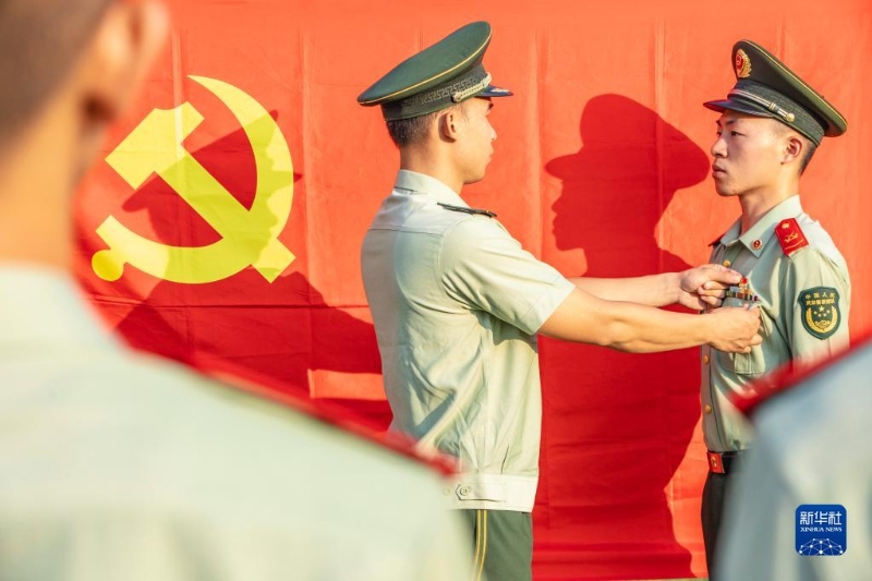 武警廣西總隊桂林支隊開展主題黨日活動,某中隊指導員為新黨員佩戴黨徽(6月29日攝)。