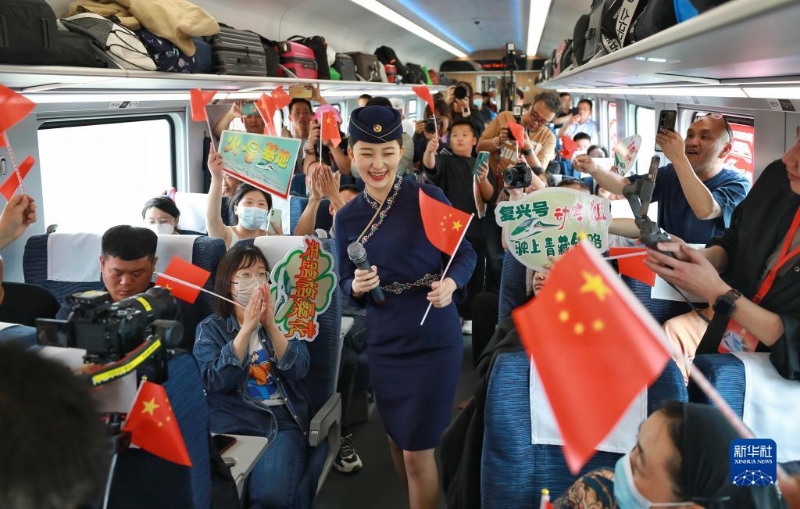 7月1日,在C891次西寧至格爾木動(dòng)車組列車上,乘務(wù)員與乘客互動(dòng)。