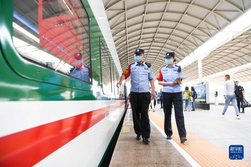 7月1日,C891次西寧至格爾木動(dòng)車組列車值乘民警在做出發(fā)前的檢查。