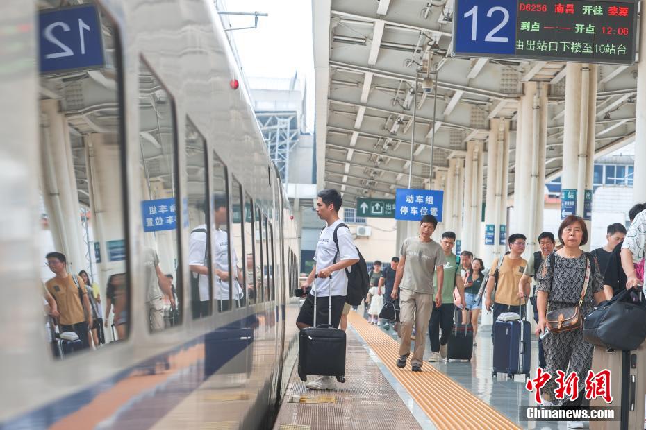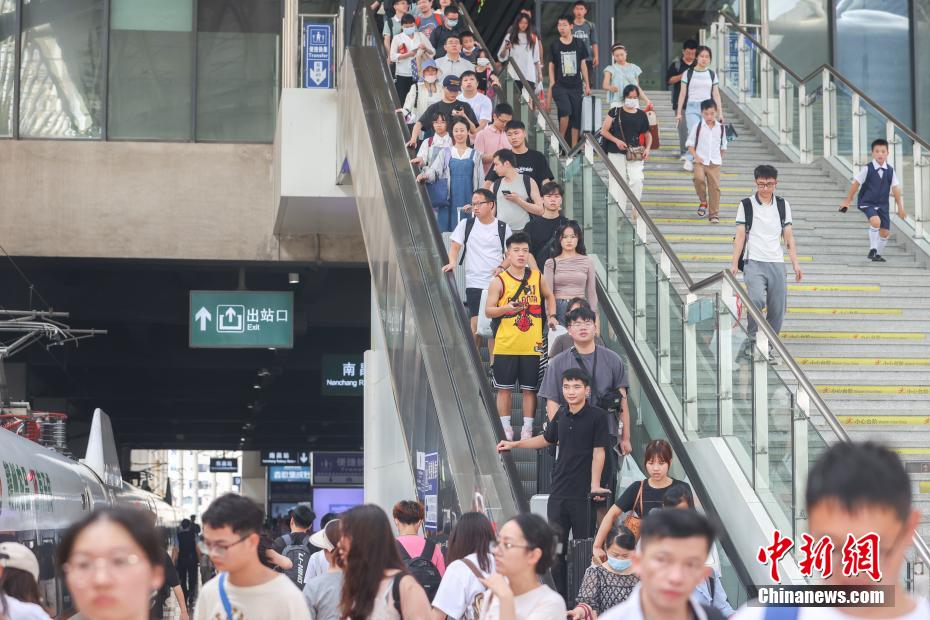 7月1日,為期62天的2023年全國鐵路暑期運輸啟動。7月1日至8月31日,全國鐵路預(yù)計發(fā)送旅客7.6億人次,日均發(fā)送1200萬人次以上。 圖為江西南昌站,不少旅客從站臺上走過。劉力鑫 攝