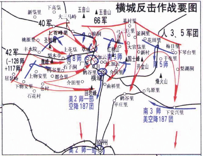 一是形成鉗形攻擊。經(jīng)過短時(shí)間火力急襲后,志愿軍以鉗形攻勢迅速發(fā)起進(jìn)攻。第42軍從西南和正西方向發(fā)起攻擊后,第124師迅速占領(lǐng)上物安里等要地,為第117師和第125師打開進(jìn)攻通道,至2月12日晨占領(lǐng)廣田,并與第40軍第118師一部會(huì)合,迅速前出至夏日地區(qū)完全截?cái)嗄铣r第8師與橫城的聯(lián)系,2月12日10時(shí),志愿軍前出至回巖峰截殲?zāi)咸又當(dāng)场5?0軍從西北方向發(fā)起攻擊后,左翼第120師迅速攻占圣智峰和梨木亭,左翼第118師迅速進(jìn)占廣田,一部與第42軍第124師會(huì)合,形成對橫城之?dāng)车暮香Q。第66軍從北部方向發(fā)起進(jìn)攻后,第198、第197、第196師先后攻占草塘、紅桃山、大官岱里等要地。反擊作戰(zhàn)過程中,志愿軍曾兩次嚴(yán)令第66軍“主力應(yīng)向橫城以南急進(jìn),務(wù)必于明(十二)日拂曉前將橫城南逃敵退路切斷”。至2月12日8時(shí),志愿軍基本殲滅橫城以北南朝鮮第8師3個(gè)團(tuán)。美軍一部在美軍空軍掩護(hù)下企圖突圍,被志愿軍第117師阻于夏日地區(qū)。至當(dāng)日21時(shí),全殲?zāi)铣r軍2個(gè)營,等等。在志愿軍橫城作戰(zhàn)的同時(shí),人民軍從東北方向發(fā)起進(jìn)攻,殲滅南朝鮮第3師、第5師各一部,有力配合反擊作戰(zhàn)。