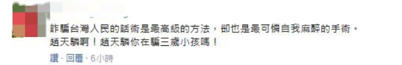 也有臺灣網(wǎng)友評論表示“果然是綠色邏輯思維,沒有最勇敢,只有最無知!”“趙天麟是在說相聲嗎?真愛鬼扯!”“詐騙臺灣人民的話術是最高級的方法,卻也是最可憐自我麻醉的手術!趙天麟啊!趙天麟你在騙三歲小孩嗎?”