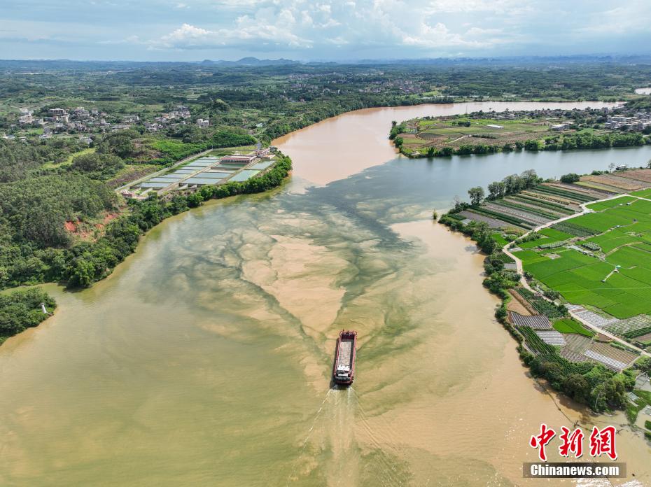 7月4日,廣西南寧三江口左右江交匯處,渾濁的左江與清澈的右江黃綠分明,呈現(xiàn)出類似鴛鴦糊(芝麻糊+花生糊)的效果,場面壯觀。每年進(jìn)入汛期后,該交匯處常常出現(xiàn)“鴛鴦江”景觀。據(jù)悉,左江源于越南北部大山,至南寧市江西鎮(zhèn)同江村三江坡與發(fā)源于云南廣南龍山的右江匯合,成為邕江的源頭。每年汛期,暴雨洪水通常會導(dǎo)致江水變黃,而右江因上游百色段大型水庫的沉積作用,攔截了大部分泥沙,在與左江交匯前仍能保持清澈的綠色。圖為船只通過“鴛鴦江”。陳冠言 攝