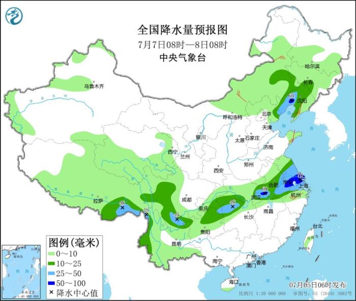 7月7日08時至8日08時,內(nèi)蒙古東南部、東北地區(qū)南部、江淮、江南北部、四川西部和南部、貴州北部、云南西部等地部分地區(qū)有中到大雨,其中,遼寧西部、安徽東南部、江蘇中南部、湖北東部等地部分地區(qū)有暴雨(50~70毫米)。內(nèi)蒙古中東部、遼寧、山東半島、浙江北部等地部分地區(qū)有4~6級風。