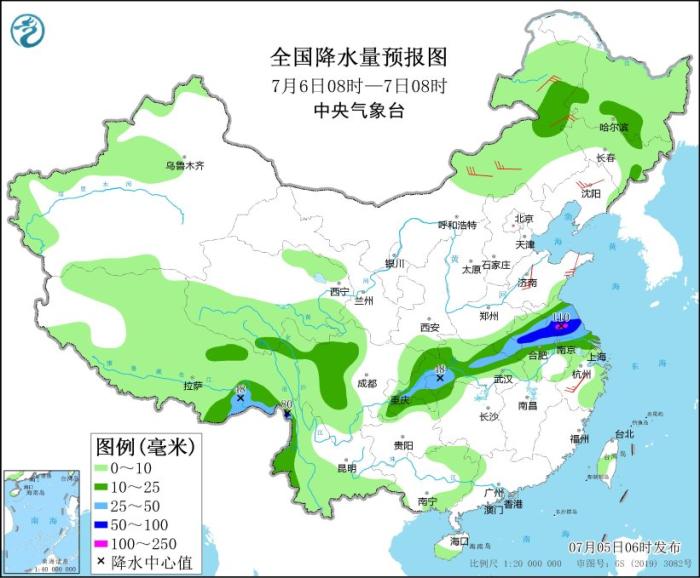7月6日08時至7日08時,內(nèi)蒙古東北部、黑龍江南部、西藏東部、江淮、江漢中南部、江南東北部、川西高原、重慶、云南西部等地部分地區(qū)有中到大雨,其中,蘇皖中部等地部分地區(qū)有暴雨或大暴雨(100~110毫米)。內(nèi)蒙古中東部、遼寧、山東、浙江中部等地部分地區(qū)有4~6級風。