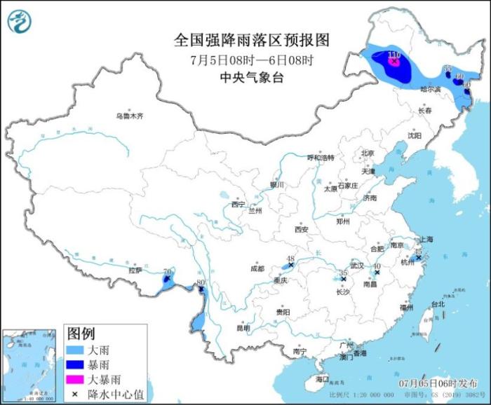 7月5日08時至6日08時,內(nèi)蒙古東北部、黑龍江中南部以及云南西部、重慶中部、浙江北部等地部分地區(qū)有大到暴雨,其中,內(nèi)蒙古東北部局地有大暴雨(100~110毫米)。內(nèi)蒙古中東部、東北地區(qū)、河北中南部和東北部、山東半島、江蘇中部、浙江中部等地部分地區(qū)有4~6級風。