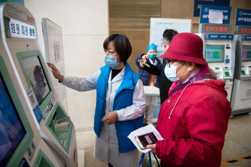 2020年12月9日,在首都醫(yī)科大學(xué)附屬北京天壇醫(yī)院,工作人員在幫助老年人使用自助機(jī)查詢號(hào)源。新華社記者 陳鐘昊 攝