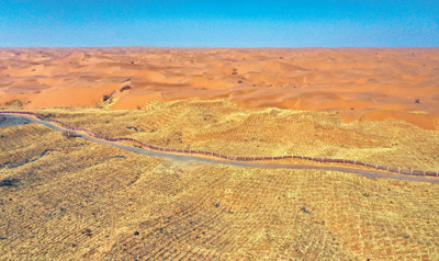 麥草方格沙障有效固定了流沙。記者 秦瑞杰攝