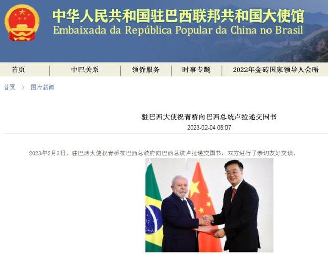 2月3日,中國駐巴西大使祝青橋在巴西總統(tǒng)府向巴西總統(tǒng)盧拉遞交國書。圖片來源:中國駐巴西大使館網(wǎng)站截圖