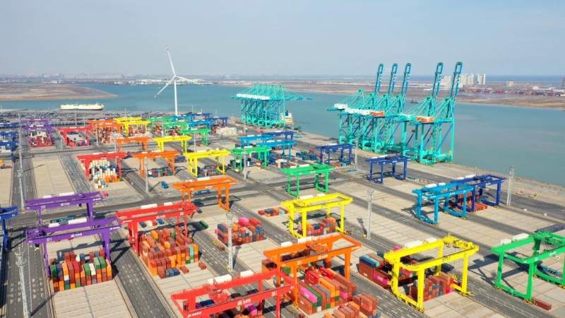 這是天津港全物聯(lián)網(wǎng)集裝箱碼頭(2023年2月21日攝,無人機(jī)照片)。(新華社記者趙子碩攝)