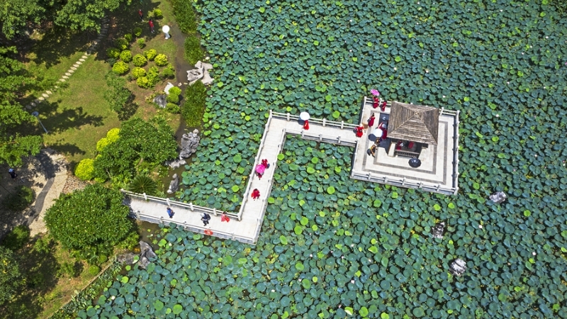 6月28日,游客在廣西南寧市獅山公園觀賞荷花(無人機(jī)照片)。新華社發(fā)(趙京武攝)