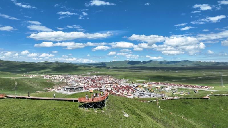 游客在甘南藏族自治州瑪曲縣阿萬倉濕地的觀景平臺(tái)上游覽(7月6日攝,無人機(jī)照片)。新華社記者 陳斌 攝