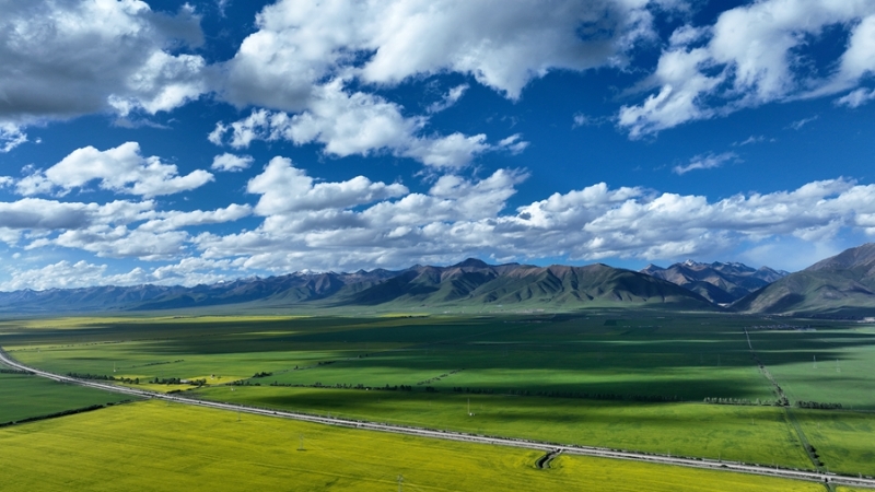 夏日,在位于祁連山腹地的青海省海北藏族自治州門源回族自治縣境內(nèi),油菜花競相綻放,花海、雪山、草原共同組成色彩斑斕的祁連山夏日畫卷。新華社記者 韓方方 攝