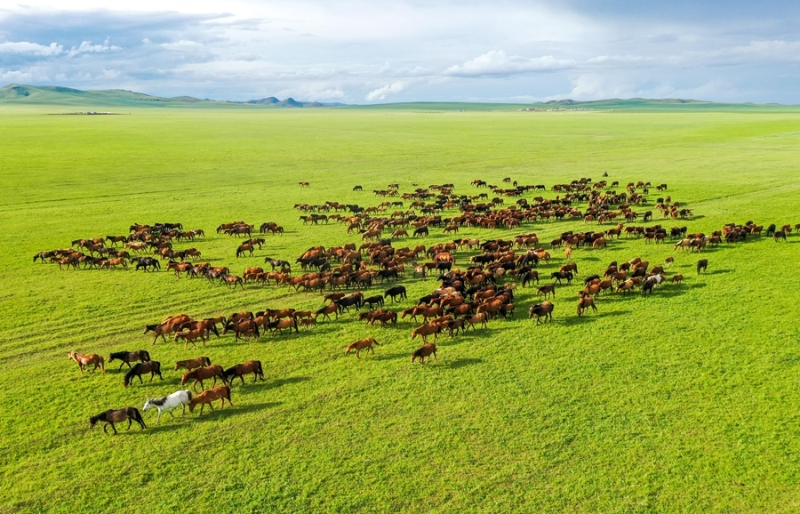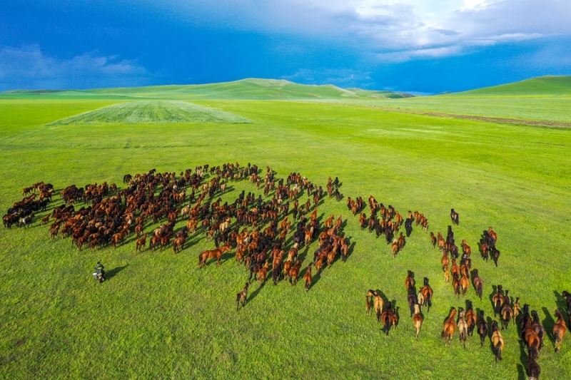 7月5日,馬群在草原上奔跑(無人機(jī)照片)。 新華社記者 連振 攝