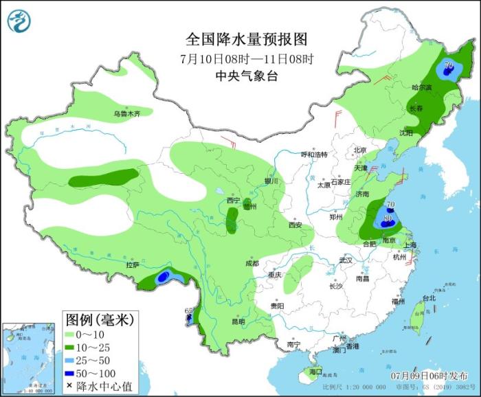 7月10日08時至11日08時,黑龍江中東部、吉林中東部、遼寧東北部、山東南部、江蘇中北部、安徽中北部、甘肅西南部、云南西部、西藏東南部等地部分地區(qū)有中到大雨,其中,黑龍江東部、江蘇中北部、云南西部、西藏東南部等局地有暴雨(50~80毫米)(見圖4)。