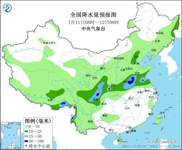 圖3 全國降水量預(yù)報圖(7月9日08時-10日08時)