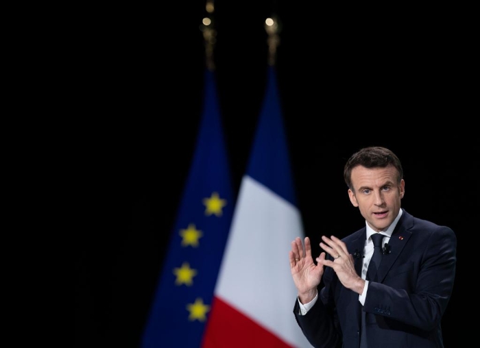 2022年3月17日,法國總統(tǒng)馬克龍?jiān)诎屠璞苯既{-圣但尼省舉行的新聞發(fā)布會(huì)上介紹競(jìng)選綱領(lǐng)。新華社發(fā)(肖恩·洛朗攝)