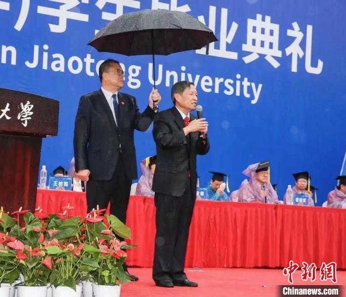 圖為西安交通大學(xué)畢業(yè)典禮當(dāng)日,該校黨委書(shū)記盧建軍為校長(zhǎng)王樹(shù)國(guó)撐傘?!∥靼步煌ù髮W(xué)供圖
