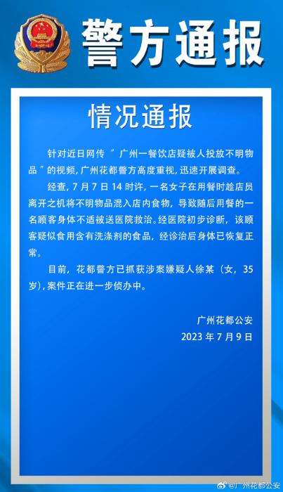 中新網(wǎng)7月9日電 據(jù)廣州市公安局花都區(qū)分局官方微博消息,針對(duì)近日網(wǎng)傳“廣州一餐飲店疑被人投放不明物”的視頻,廣州花都警方高度重視,迅速開展調(diào)查。
