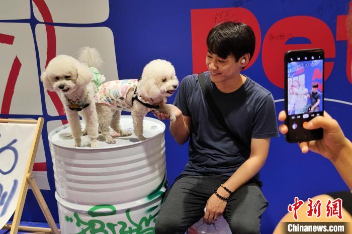 近日,在天津印象城,寵物吸引青年合影。 中新社記者 佟郁 攝
