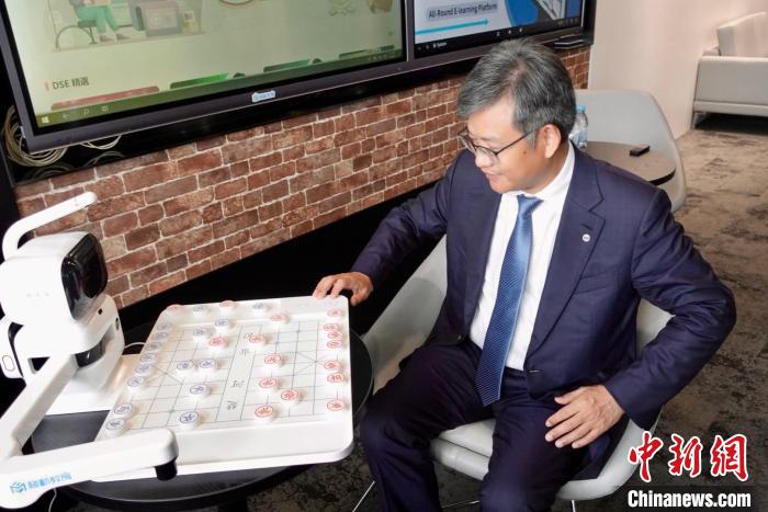 李鋒在中國移動(dòng)“聯(lián)創(chuàng)+”香港5G開放實(shí)驗(yàn)室與AI下棋機(jī)器人進(jìn)行“人機(jī)對(duì)戰(zhàn)”。中新社記者 戴小橦攝