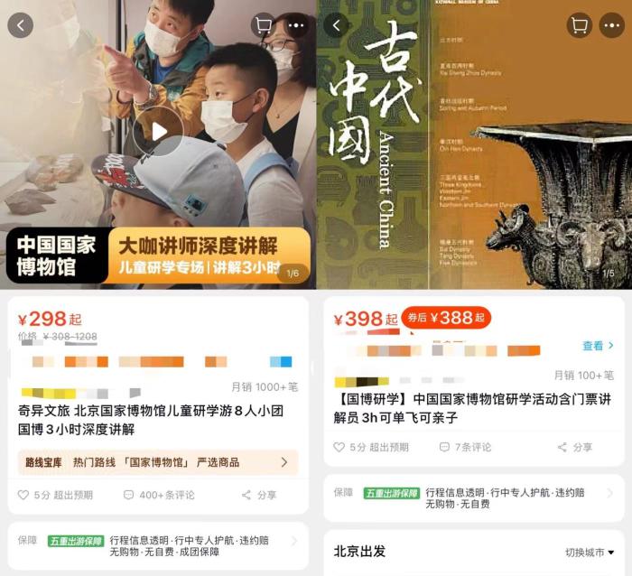 中新網(wǎng)在電商平臺上發(fā)現(xiàn),一些研學(xué)機(jī)構(gòu)商家可以提供博物館講解服務(wù),價格在168-388元不等,講解時間為2-3小時。例如,國家博物館“古代中國”展的講解項目,某機(jī)構(gòu)按照每人388元進(jìn)行收費(fèi),講解3小時,平均每小時129元,成團(tuán)人數(shù)為12人起,滿團(tuán)25人。這家機(jī)構(gòu)承諾提供訂票服務(wù),不用游客自行預(yù)約,保證順利入館。