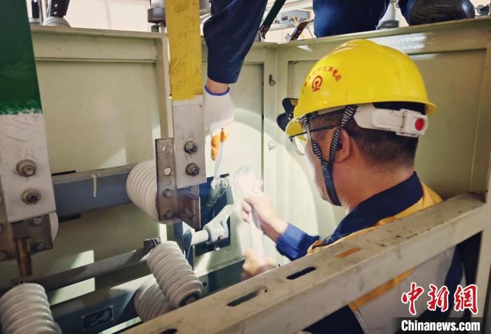 檢修人員給母線線排刷漆。 胡德堅 攝