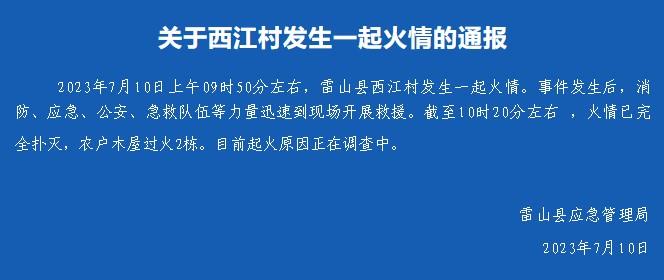 中新網(wǎng)7月10日電 7月10日上午,網(wǎng)傳貴州黔東南雷山縣西江千戶苗寨景區(qū)一棟木質(zhì)結(jié)構(gòu)建筑發(fā)生火災(zāi)。據(jù)雷山縣融媒體中心微信公眾號(hào)10日消息,貴州雷山縣應(yīng)急管理局發(fā)布通報(bào)稱,10日上午09時(shí)50分左右,雷山縣西江村發(fā)生一起火情。事件發(fā)生后,消防、應(yīng)急、公安、急救隊(duì)伍等力量迅速到現(xiàn)場(chǎng)開(kāi)展救援。截至10時(shí)20分左右 ,火情已完全撲滅,農(nóng)戶木屋過(guò)火2棟。目前起火原因正在調(diào)查中。