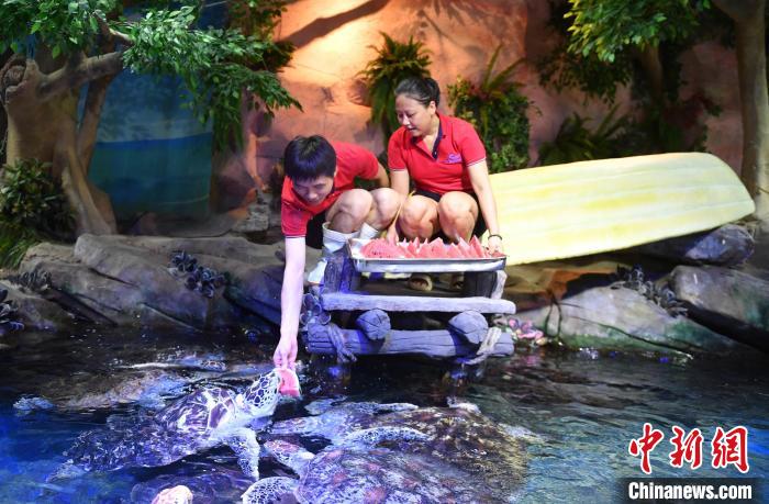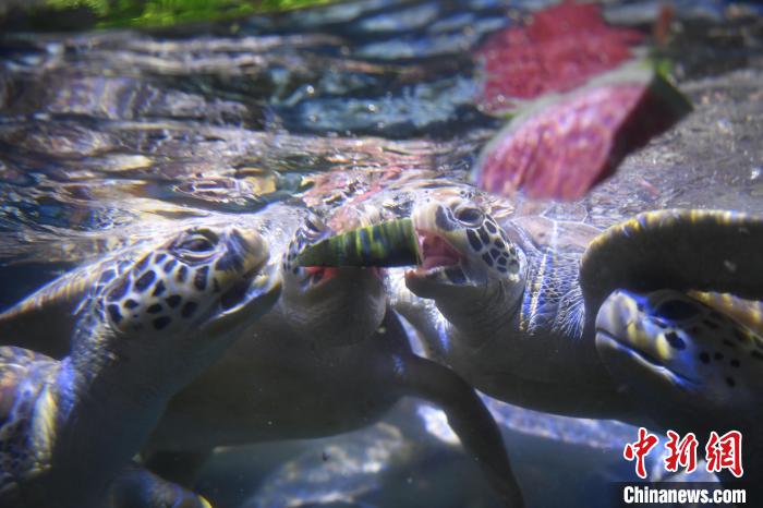 飼養(yǎng)員為海龜準(zhǔn)備西瓜解暑?!∮菘〗?攝