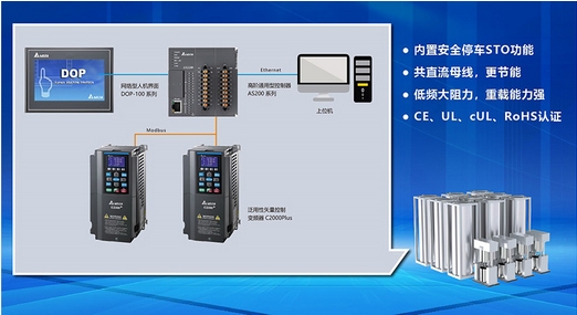 臺達(dá)方案應(yīng)用高性能矢量控制變頻器CP2000 Plus系列,超重載型過載能力強(qiáng),防濾波、防噪聲干擾能力強(qiáng);產(chǎn)品符合多種國際標(biāo)準(zhǔn)和歐盟標(biāo)準(zhǔn),能夠滿足設(shè)備廠商出海要求;多樣化通訊模式支持各種設(shè)備生產(chǎn)需要。