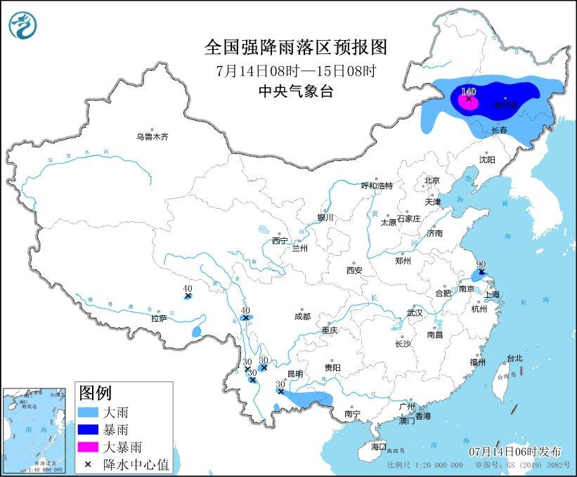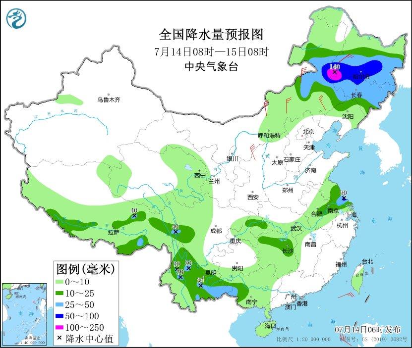 7月14日08時至15日08時,內(nèi)蒙古東部、東北地區(qū)大部、江蘇中南部、安徽南部、重慶北部、廣西西南部、云南大部、西藏東北部和南部等地部分地區(qū)有中到大雨,其中,內(nèi)蒙古東北部、黑龍江南部、吉林中西部等地部分地區(qū)有暴雨或大暴雨(100~140毫米)。內(nèi)蒙古中東部等地部分地區(qū)有4~6級風(fēng)(見圖4)。