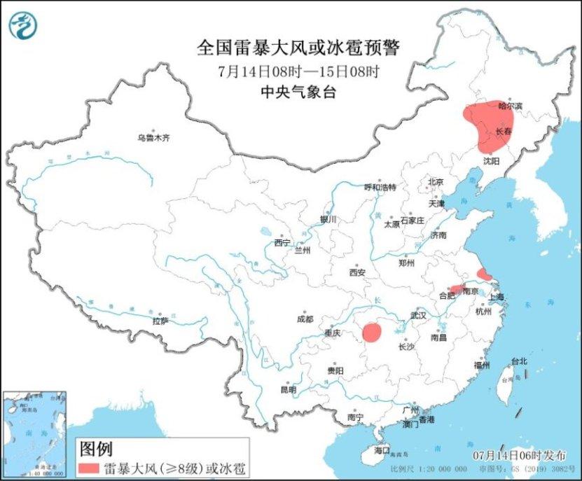 預(yù)計,7月14日08時至15日08時,內(nèi)蒙古東北部、黑龍江南部、吉林、遼寧北部、江蘇南部、云南西北部和南部等地部分地區(qū)有大到暴雨,其中,內(nèi)蒙古東北部、吉林西部等地部分地區(qū)有大暴雨(100~140毫米)。上述部分地區(qū)伴有短時強(qiáng)降水(最大小時降雨量30~50毫米,局地可超過60毫米),局地有雷暴大風(fēng)等強(qiáng)對流天氣(見圖1)。內(nèi)蒙古東南部、黑龍江西南部、吉林中西部、遼寧北部、安徽中部、江蘇中部、湖南西北部等地的部分地區(qū)將有8-10級雷暴大風(fēng)或冰雹天氣(見圖2);內(nèi)蒙古東南部、黑龍江西南部、吉林中西部、遼寧北部、安徽中南部、江蘇中部、湖北東部和西南部、湖南中北部、重慶東南部、云南中西部和東南部、廣西西部、臺灣島東部等地的部分地區(qū)將有短時強(qiáng)降水天氣,小時雨量30-50毫米,局地可達(dá)60毫米以上。中央氣象臺7月14日06時繼續(xù)發(fā)布暴雨、強(qiáng)對流天氣藍(lán)色預(yù)警。