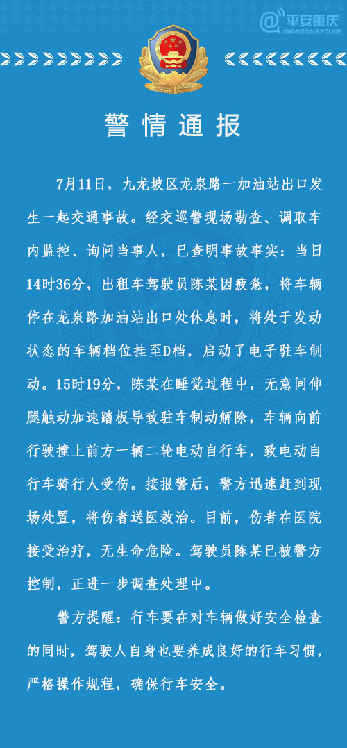 經(jīng)交巡警現(xiàn)場(chǎng)勘查、調(diào)取車(chē)內(nèi)監(jiān)控、詢(xún)問(wèn)當(dāng)事人,已查明事故事實(shí):當(dāng)日14時(shí)36分,出租車(chē)駕駛員陳某因疲憊,將車(chē)輛停在龍泉路加油站出口處休息時(shí),將處于發(fā)動(dòng)狀態(tài)的車(chē)輛檔位掛至D檔,啟動(dòng)了電子駐車(chē)制動(dòng)。15時(shí)19分,陳某在睡覺(jué)過(guò)程中,無(wú)意間伸腿觸動(dòng)加速踏板導(dǎo)致駐車(chē)制動(dòng)解除,車(chē)輛向前行駛撞上前方一輛二輪電動(dòng)自行車(chē),致電動(dòng)自行車(chē)騎行人受傷。接報(bào)警后,警方迅速趕到現(xiàn)場(chǎng)處置,將傷者送醫(yī)救治。目前,傷者在醫(yī)院接受治療,無(wú)生命危險(xiǎn)。駕駛員陳某已被警方控制,正進(jìn)一步調(diào)查處理中。
