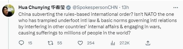 針對(duì)北約的負(fù)面涉華表態(tài),華春瑩寫道,“中國(guó)有脅迫性政策?難道不是北約在全世界搞集團(tuán)政治和軍事行動(dòng),用武力威脅別國(guó),挑戰(zhàn)全球利益、安全和價(jià)值觀嗎?”