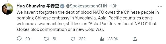 華春瑩表示,“我們沒有忘記北約轟炸中國(guó)駐南聯(lián)盟大使館,沒有忘記北約欠下中國(guó)人民的血債。亞太國(guó)家不歡迎戰(zhàn)爭(zhēng)機(jī)器,更不歡迎挑起集團(tuán)對(duì)抗或新冷戰(zhàn)的‘亞太版北約’”。