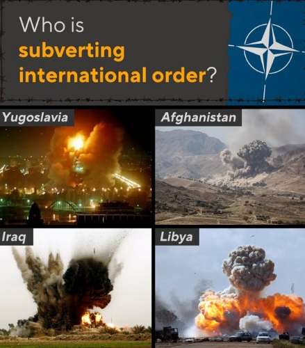 最后,華春瑩發(fā)布了一張圖片,題為“是誰(shuí)在顛覆國(guó)際秩序”。畫面上,北約的標(biāo)志之下,是南斯拉夫、阿富汗、伊拉克和利比亞發(fā)生爆炸的場(chǎng)面。對(duì)于到底“是誰(shuí)在顛覆國(guó)際秩序”這個(gè)問題,答案一目了然。