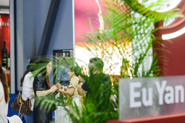 RCEP成員國(guó)企業(yè)亮相第三屆消博會(huì)。2023年4月12日,參觀者在新加坡企業(yè)余仁生的展臺(tái)了解產(chǎn)品。新華社記者王澤聰攝