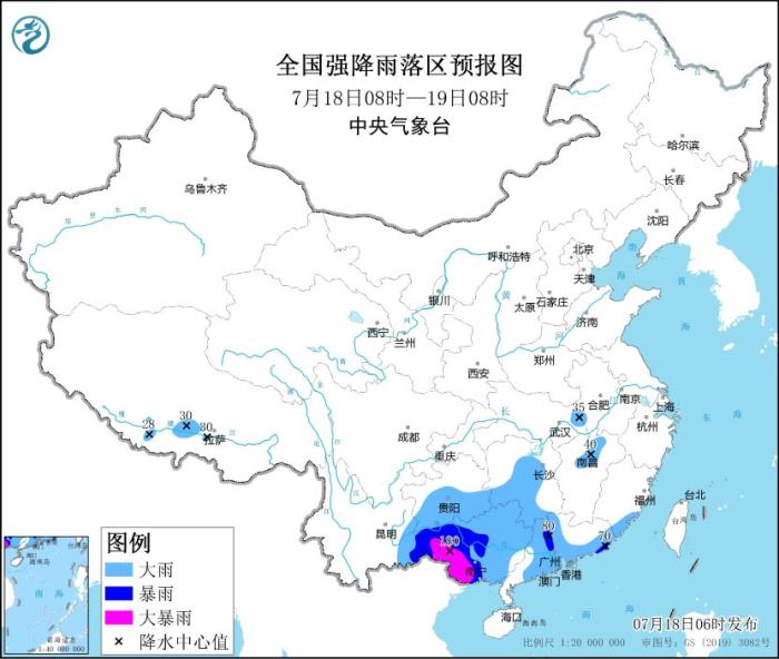 7月18日08時至19日08時,廣東大部、廣西、福建東南部、湖南中南部、貴州南部、云南東南部等地的部分地區(qū)有大到暴雨,其中,廣西西部、云南東南部等地的部分地區(qū)有大暴雨(100~180毫米);江西中北部、湖北東部、安徽西部等地的部分地區(qū)有分散性大雨或暴雨(見圖3)。內蒙古西北部、新疆南疆盆地等地的部分地區(qū)有4~5級風;北部灣將有8~9級、陣風10級的西南風。