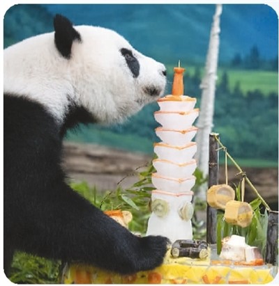 動物園為“圓仔”精心準(zhǔn)備了造型獨(dú)特的冰雕“蛋糕”,并舉辦了生日會。不少市民一早就在大熊貓館前排起長隊,為這位“頂流明星”送上生日祝福。
