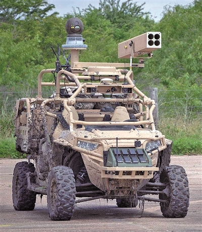 照片中這輛“北極星”超輕型全地形車,渾身沾滿黑色泥漿,似乎剛剛結(jié)束一場“實(shí)戰(zhàn)”任務(wù)。該車最引人矚目的是車頂上方加裝了一套4聯(lián)裝70毫米激光制導(dǎo)火箭彈發(fā)射裝置和一個(gè)黑色的多光譜觀瞄轉(zhuǎn)塔。另外,車體中部還有兩套通信裝置和一些前視攝像頭。在實(shí)際使用中,這套黑色的多光譜觀瞄轉(zhuǎn)塔可以將觀測到的目標(biāo)信息傳遞給火箭彈發(fā)射裝置,引導(dǎo)后者發(fā)射火箭彈進(jìn)行打擊。