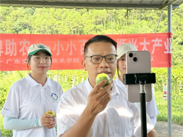 盛夏七月,正是黃金百香果成熟的季節(jié)。在肇慶市廣寧縣木格鎮(zhèn)“黃金百香果”種植基地,“知明行篤”社會(huì)實(shí)踐隊(duì)結(jié)合自身專業(yè)特長(zhǎng)與技術(shù)優(yōu)勢(shì),正在開展“小小百香果,振興大產(chǎn)業(yè)”微視頻直播宣傳活動(dòng)。實(shí)踐隊(duì)員對(duì)果園鮮果進(jìn)行采摘直切展示,并現(xiàn)場(chǎng)試吃,讓“百香果”新鮮看得見(jiàn)。直播現(xiàn)場(chǎng)如火如荼,線上粉絲熱情似火,互動(dòng)頻頻。