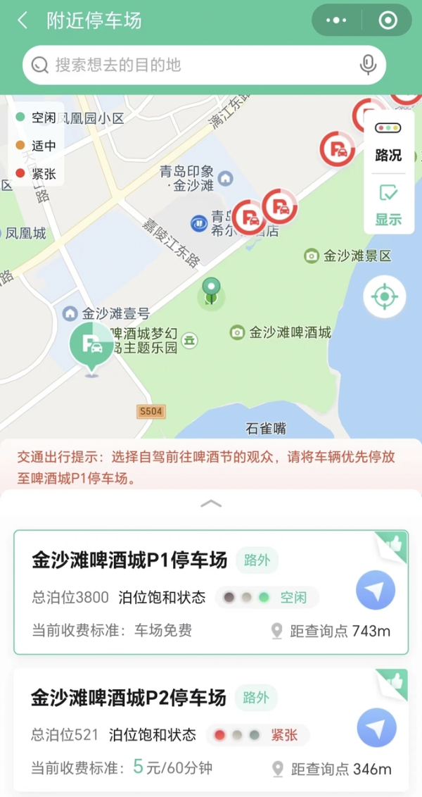 小程序與交通管控場景化指揮平臺打通,解決停車難題。一方面開發(fā)啤酒節(jié)活動停車專題,節(jié)前通過多渠道宣傳發(fā)布,公眾通過小程序打開即可看見啤酒節(jié)周邊停車場分布、實(shí)時空閑車位、價格等信息。另一方面,實(shí)時監(jiān)測停車場空余泊位,及時對外發(fā)布停車誘導(dǎo)信息。當(dāng)出現(xiàn)停車場飽和時,形成預(yù)警信息實(shí)時推送場景化指揮平臺提醒工作人員處置,實(shí)現(xiàn)停車需求合理分流。同時針對啤酒節(jié)P1停車場包含3800車位普遍存在的尋車難問題,小程序提供掃碼定位服務(wù),車主可快速記錄停車位置并根據(jù)尋車路線引導(dǎo)快速找到車輛。