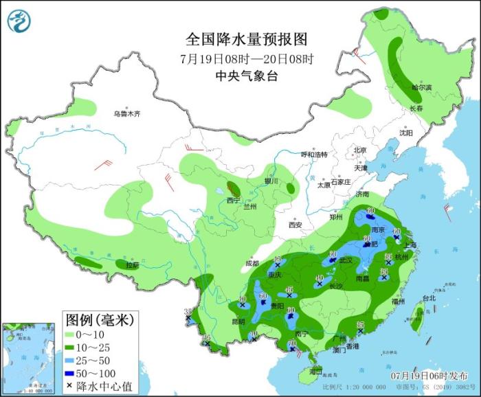 7月19日08時(shí)至20日08時(shí),黃淮東南部、江淮、江漢東部和南部、江南中北部、西南地區(qū)東部和南部、華南等地部分地區(qū)有中到大雨,其中,貴州西部、湖北東部、安徽中北部、廣西北部和南部沿海等地局地有暴雨(50~70毫米)。新疆南疆盆地、內(nèi)蒙古東北部等地的部分地區(qū)有4~6級(jí)風(fēng)(見(jiàn)圖1)。