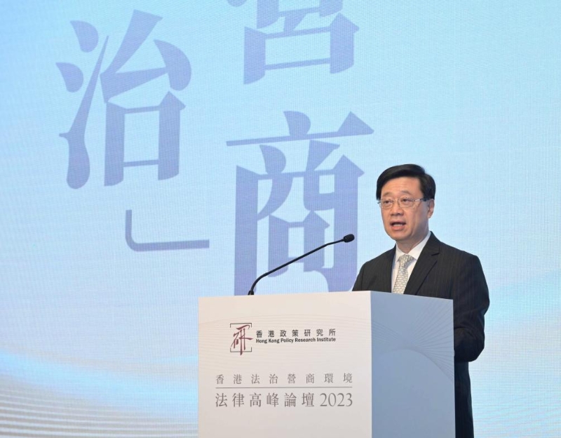 7月18日,香港特區(qū)行政長(zhǎng)官李家超在“香港法治營(yíng)商環(huán)境——法律高峰論壇2023”上致辭。新華社發(fā)(香港特區(qū)政府新聞處供圖)