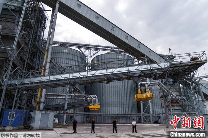 2022年7月29日,安保人員站在敖德薩海港中的一個糧食儲存碼頭前。