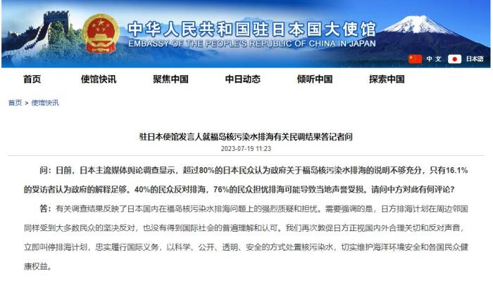 中新網(wǎng)7月19日電 據(jù)中國駐日本大使館網(wǎng)站消息,中國駐日本使館發(fā)言人就福島核污染水排海有關民調(diào)結(jié)果答記者問時表示,日方排海計劃在周邊鄰國同樣受到大多數(shù)民眾的堅決反對,也沒有得到國際社會的普遍理解和認可;再次敦促日方正視國內(nèi)外合理關切和反對聲音,立即叫停排海計劃。