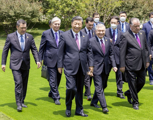 中亞五國(guó)元首相繼抵達(dá)。習(xí)近平同五國(guó)元首親切握手并集體合影。