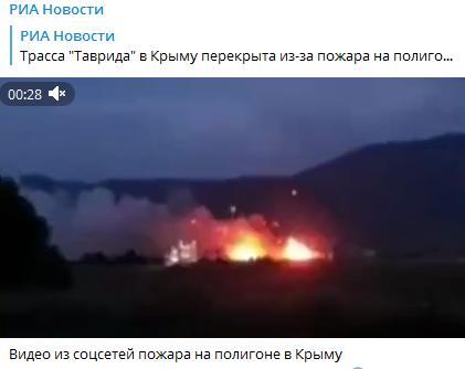 社交媒體上發(fā)布的視頻顯示克里米亞一訓練場發(fā)生火災。圖片來源:俄新社社交媒體截圖