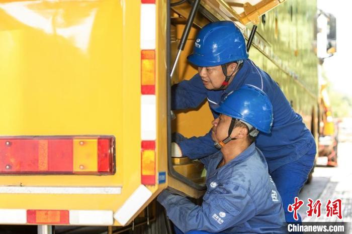 國家電網(wǎng)成都大運(yùn)會(huì)電力保障隊(duì)隊(duì)員檢查和測試應(yīng)急發(fā)電車接入功能。安偉攝